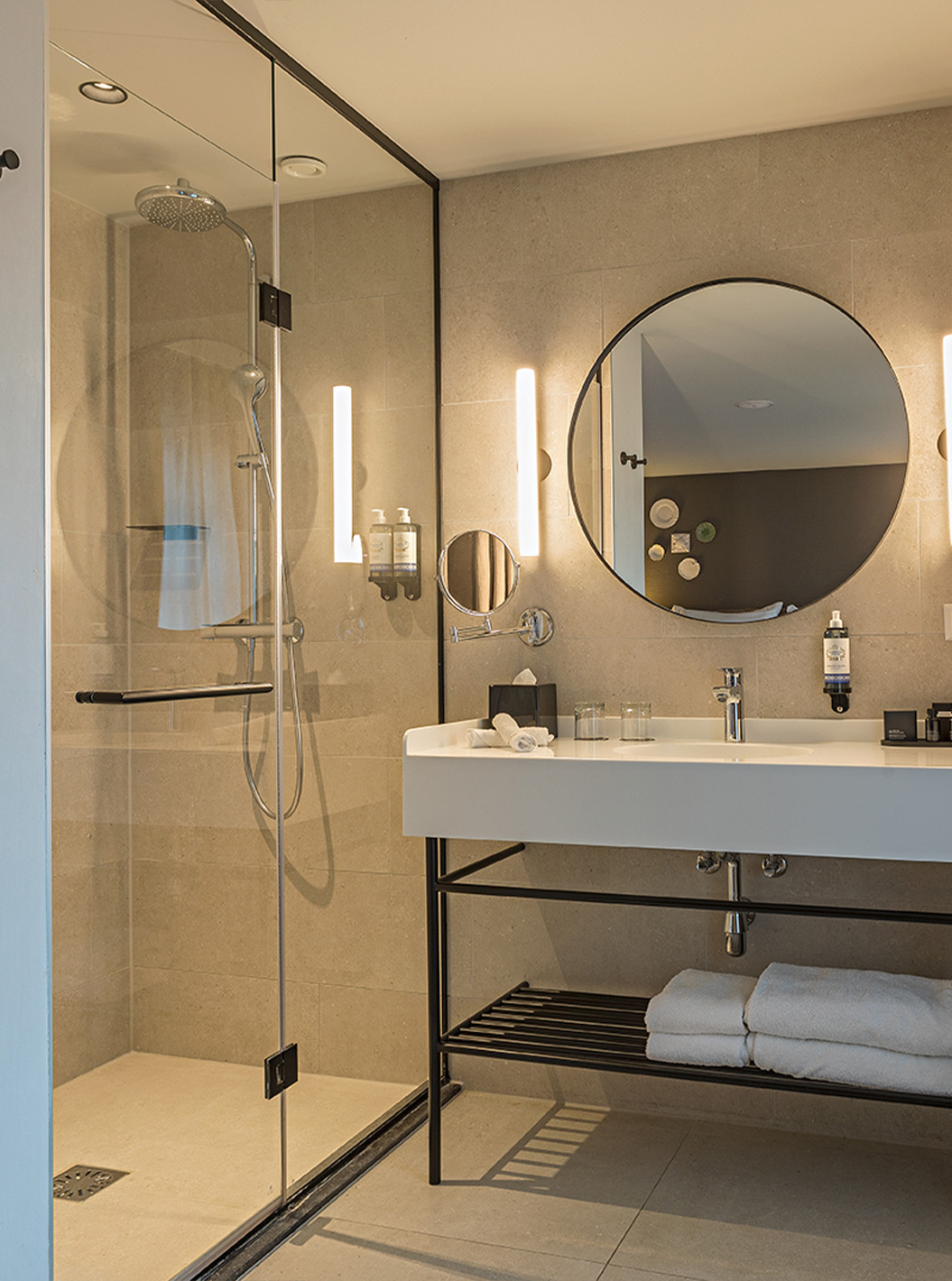 Mezzanine Suite at Pestana Amsterdam Riverside has a bathroom with mirror, sink, towels and shower
