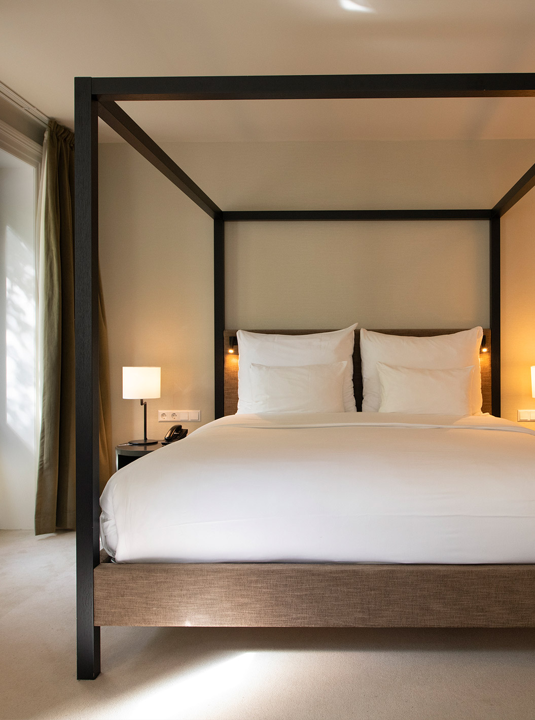 Junior Suite - River View at Pestana Amsterdam Riverside has a double bed with canopy and a green sofa